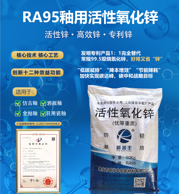 RA95活性氧化鋅它原是新潤(rùn)豐湖南總部與美國(guó)(Kenedy Space Center)共同研發(fā)出來(lái)應(yīng)用于航空航天領(lǐng)域的一種納米級(jí)別的氧化鋅新材料。它是少數(shù)幾種可以實(shí)現(xiàn)量子尺寸效應(yīng)的氧化物型半導(dǎo)體材料,在此航空材料基礎(chǔ)上廣東新潤(rùn)豐鋅業(yè)公司陶瓷事業(yè)部博士研發(fā)團(tuán)隊(duì)再經(jīng)過(guò)一年多的時(shí)間,聯(lián)合有色金屬高校成立產(chǎn)學(xué)研科技創(chuàng)新材料項(xiàng)目,研制發(fā)明制備了可以應(yīng)用于陶瓷釉面的RA95釉用活性晶粒氧化鋅,并且在納米晶格上進(jìn)行改性——晶格位移包覆銨基鋅后再進(jìn)行高溫填充硅酸鹽納米活性劑,改變了亞納米晶粒的高溫分子運(yùn)動(dòng)性能,該釉用活性氧化鋅創(chuàng)新材料已經(jīng)獲得發(fā)明專利。
